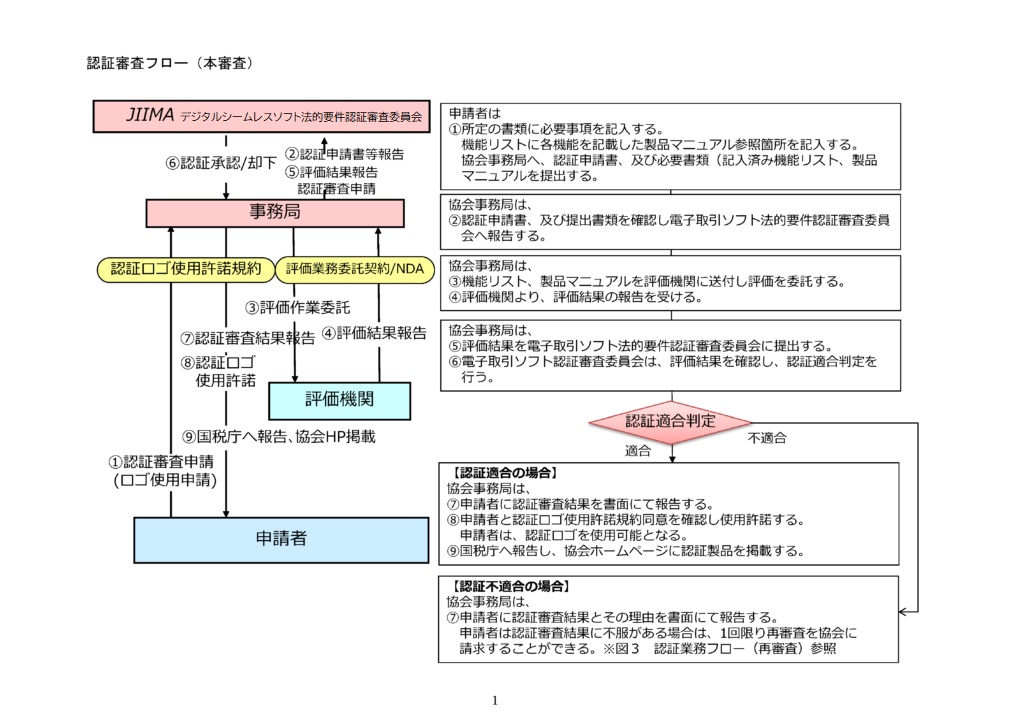 - 協会事務局は、デジタルシームレスソフト法的要件認証審査委員会に評価結果を提出し、認証審査委員会は、その合否を審議・判断する。