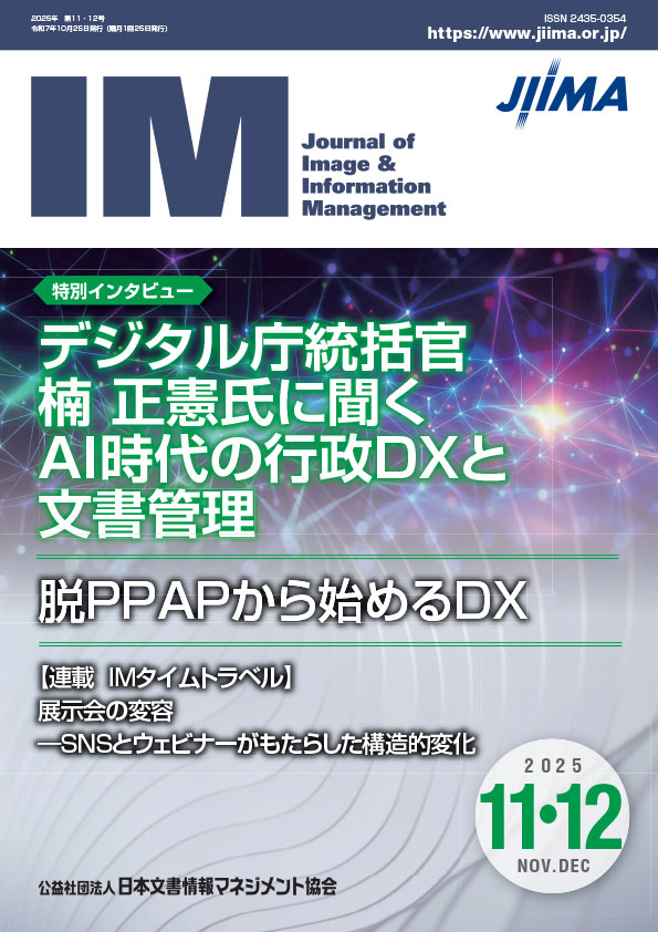 機関誌IM11・12月号の【特別インタビュー】では、「デジタル庁統括官・楠正憲氏」へのインタビューを実施。行政DXと文書管理の最新動向を通じて、非構造化データの利活用や生成AI活用しDXを進めるためには文書やデータを整備し文書管理を徹底することが、今後の鍵であると語られました。