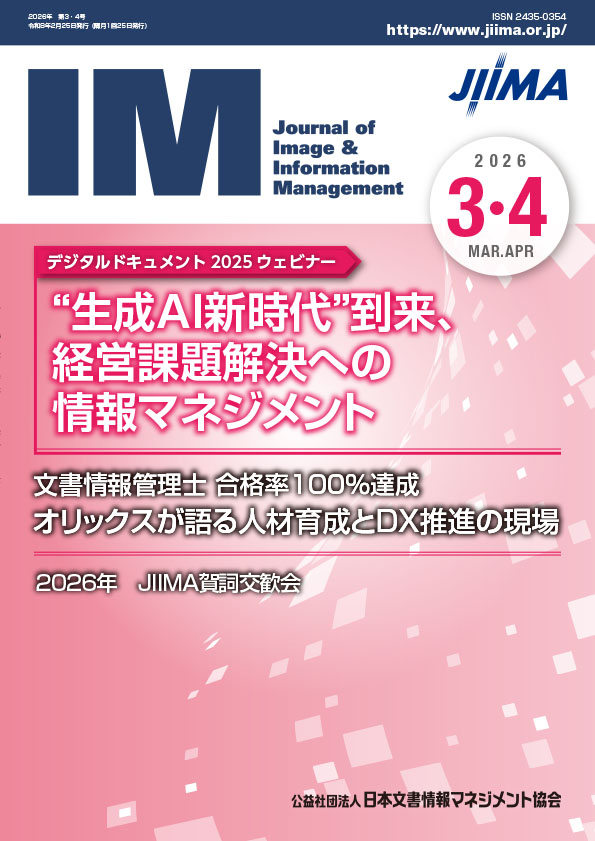 機関誌IM 2026年3・4月号では、「デジタルドキュメント2025 ウェビナー」を特集として取り上げ、“生成AI新時代”における経営課題解決と情報マネジメントの在り方を多角的に展望しています。生成AIの活用が本格化する中で、DXの深化とAI実装の加速が進む一方、その基盤となるのは信頼性の高い情報資産の整備と適切な文書管理です。本特集では、最新事例やベストプラクティス賞の紹介を通じて、AI時代に求められる情報マネジメントの具体像を提示しています。