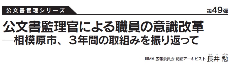 相模原市職員の不祥事に端を発し、検討を重ねた後に創設した公文書監理官(以下、監理官)制度について、その経緯を中心に『機関誌IM』(2023年1・2月号)で「全国自治体初の公文書監理官を設置した相模原市」をテーマに書かせて頂いた。その中で特に訴求したかったことは、相模原市の事例を見て適切な公文書管理には専門職員と職員研修が欠かせないことだった。
